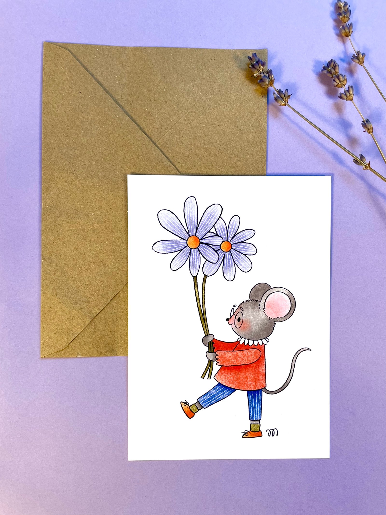 Carte postale Bouquet - Illustration souris et fleurs