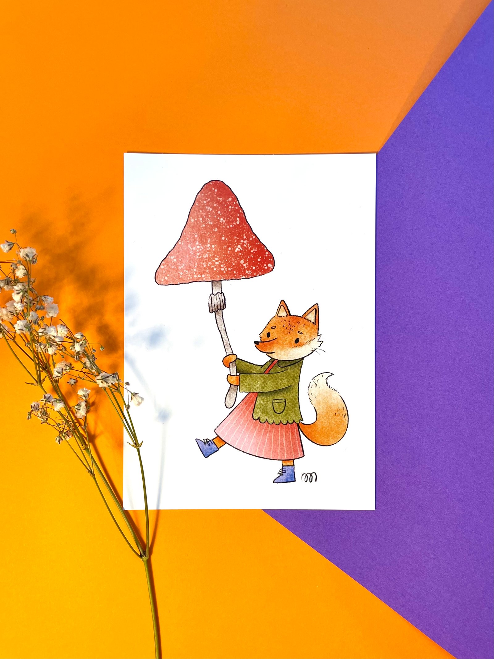 Carte postale Cueillette - Illustration renarde et champignon